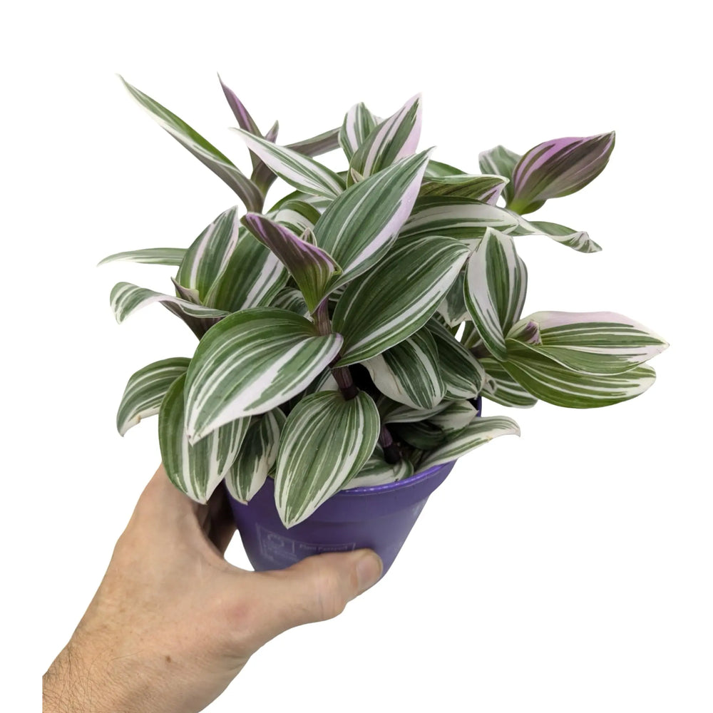 Tradescantia fluminensis ‘Tricolour’ is a standout trailing plant with soft pink, creamy white, and fresh green stripes running through each leaf. It’s bright, cheerful, and ideal for adding colour to shelves, hanging planters, or windowsills without overpowering a space. In good light, the colours really pop, giving it that just-right balance of delicate and eye-catching.