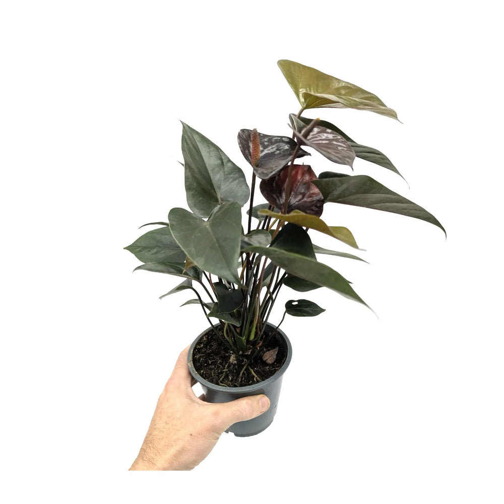 Anthurium Black Love is a stunning compact tropical houseplant that brings dramatic elegance to any indoor space. Known for its glossy dark green foliage and striking deep burgundy to near-black spathes with contrasting central spikes, this rare anthurium variety offers a sophisticated twist on the classic flamingo flower.